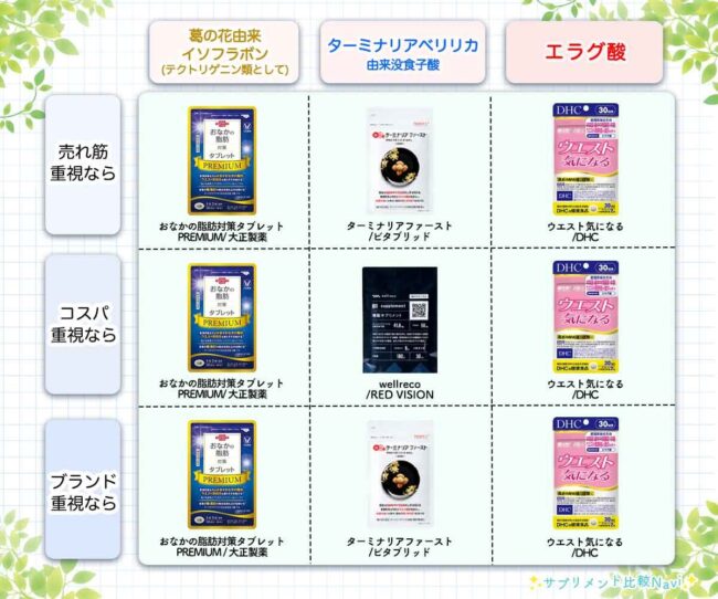 そして、この表にある成分別のおすすめサプリは以下のようになっています。