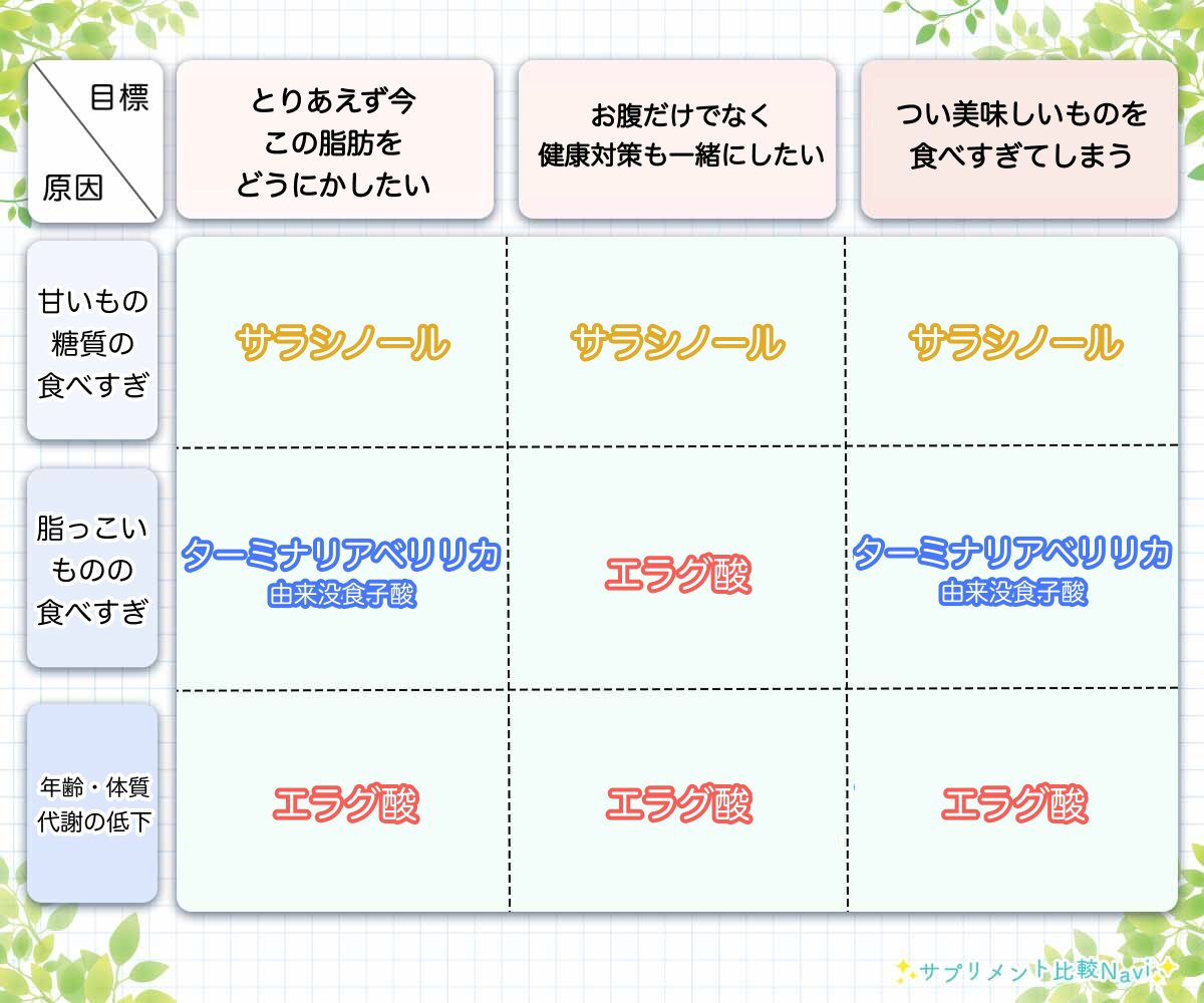 まずはあなたの「脂肪がつきやすい原因・悩み」と「目標」別に摂取するべき成分を見ていきましょう。